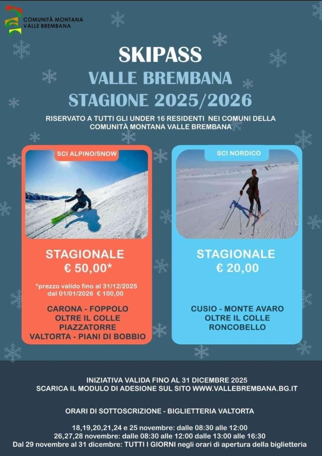 L'iniziativa è riservata a tutti gli under 16 residenti nei Comuni facenti parte della Comunità Montana Valle Brembana e permette ai ragazzi di poter sciare per tutta la prossima stagione invernale 2025/2026 a prezzi particolarmente vantaggiosi.